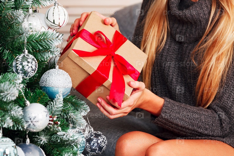 Крупный план женских рук, держащих большую подарочную коробку. Концепция Рождества