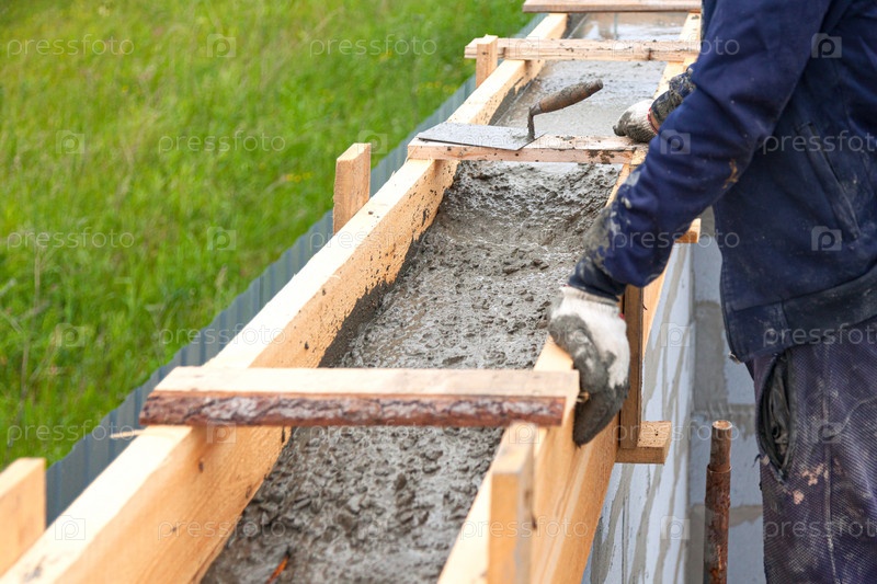 Рабочий выравнивает бетон в опалубке с помощью мастерка