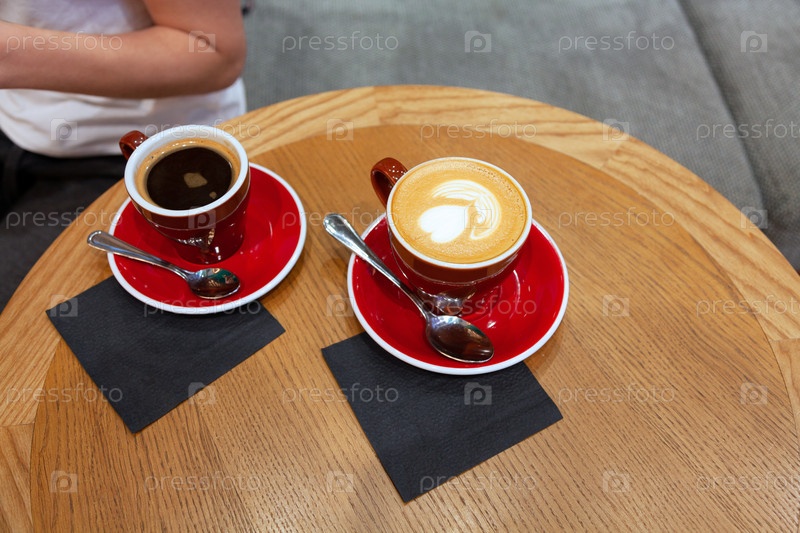 Две чашки кофе с латте-артом на деревянном столе