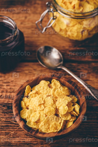 Завтрак с кукурузными хлопьями, молоком и вареньем