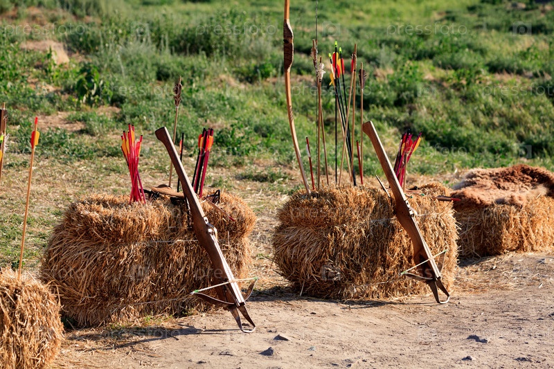 Арбалеты, лук и стрелы на соломенных блоках