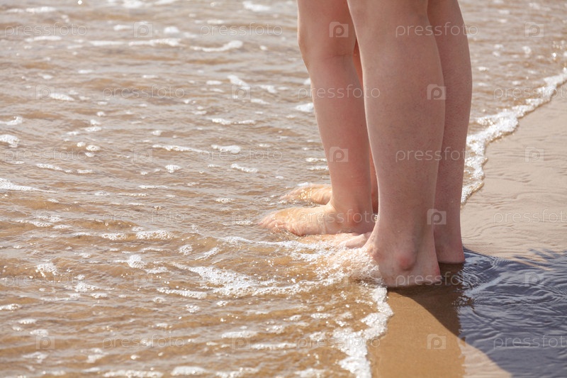 Снимок крупным планом ног матери и ее ребенка на водном пляже