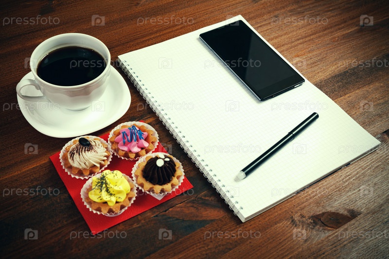 Чашка белого кофе с блокнотом, четырьмя кексами, смартфоном и ручкой на деревянном столе