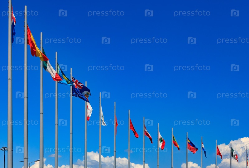 Международные флаги на фоне голубого неба