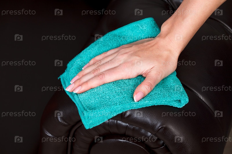 Крупный план женской руки с красивыми ухоженными пальцами, вытирающей коричневый кожаный диван