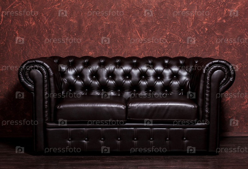 Винтажный старый темно-коричневый кожаный диван с гранж-коричневой стеной в гостиной