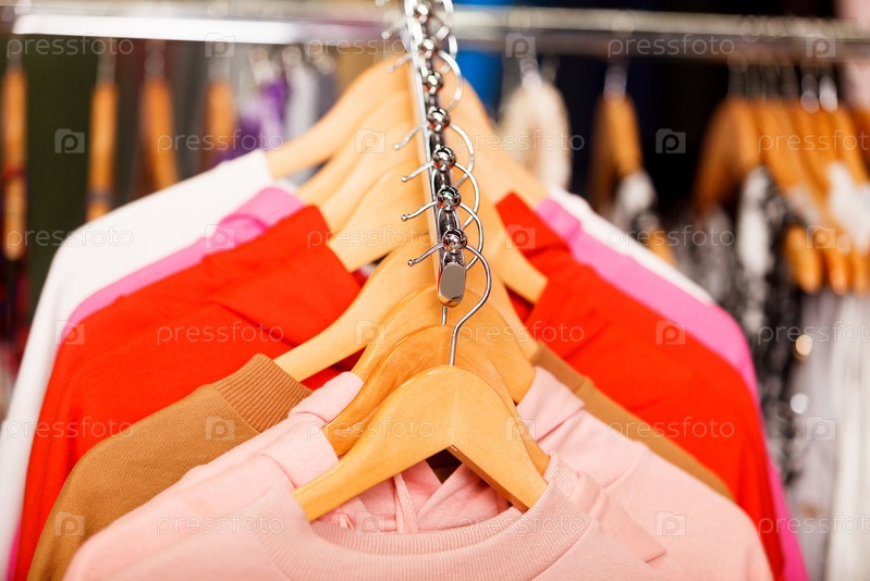 Крупный план одежды, висящей на полке в современном магазине модной одежды