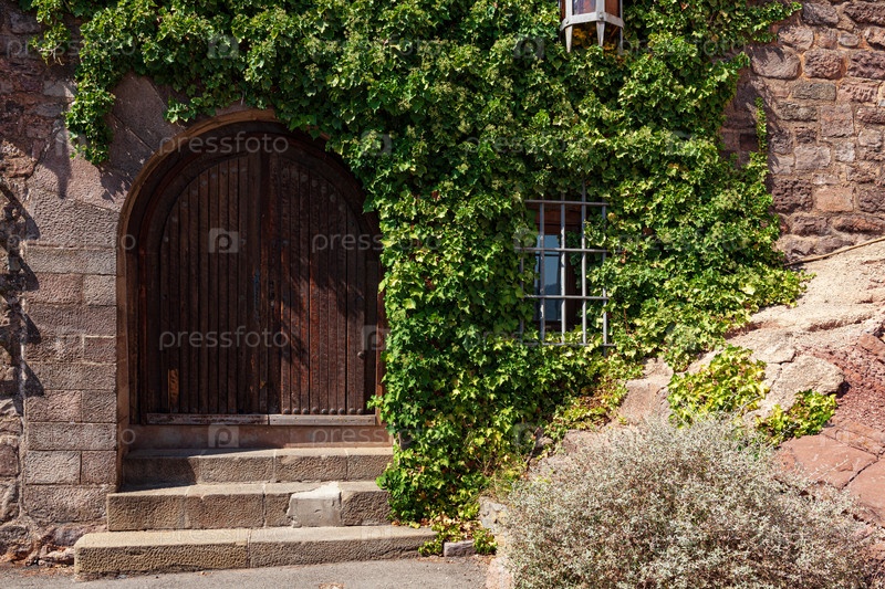 Старая деревянная дверь и коричневые кирпичи с зеленым плющом