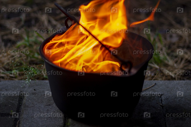 Оранжевое пламя бушующего огня в чугунном котле