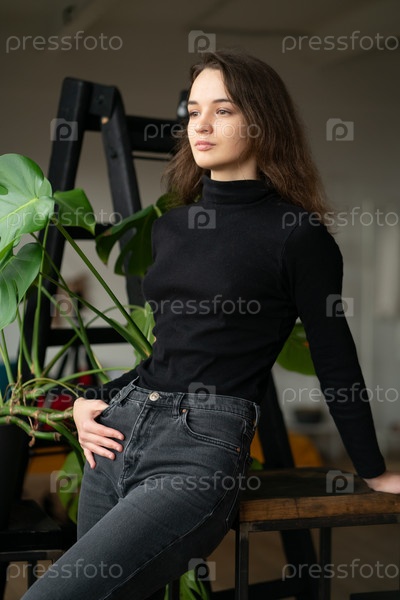 Молодая красивая женщина позирует в черном свитере в студии
