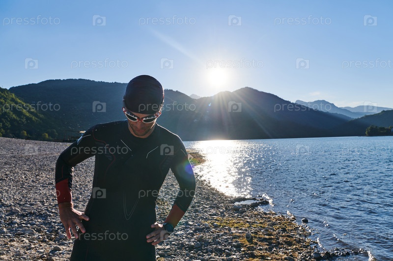 Настоящий спортсмен по триатлону готовится к тренировке по плаванию на озере