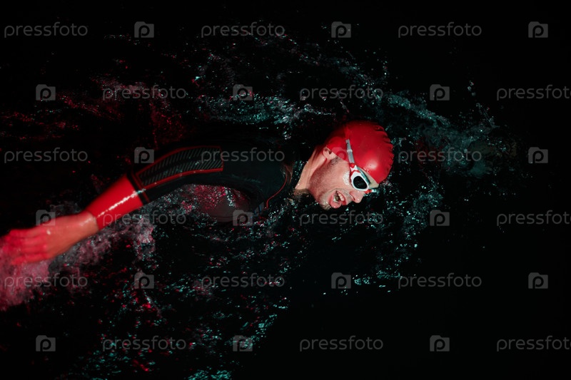 Решительный профессиональный триатлонист проходит тщательную ночную тренировку в холодной воде, демонстрируя преданность делу и стойкость в подготовке к предстоящим соревнованиям по триатлону по плаванию