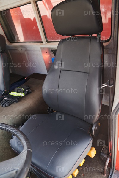 На снимке крупным планом видны сложные детали эргономичных сидений и высокотехнологичного салона современной пожарной машины, демонстрирующие идеальное сочетание функциональности и безопасности