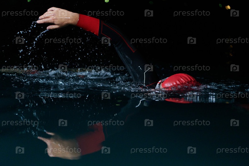 Решительный профессиональный триатлонист проходит тщательную ночную тренировку в холодной воде, демонстрируя преданность делу и стойкость в подготовке к предстоящим соревнованиям по триатлону по плаванию