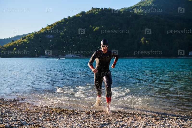 Спортсмен по триатлону начинает тренировку по плаванию на озере
