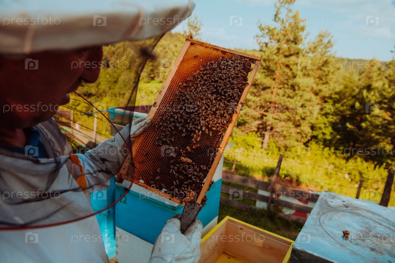 Пчеловод проверяет мед на рамке улья в поле. Владелец малого бизнеса на пасеке. Производитель натуральных здоровых продуктов питания работает с пчелами и ульями на пасеке