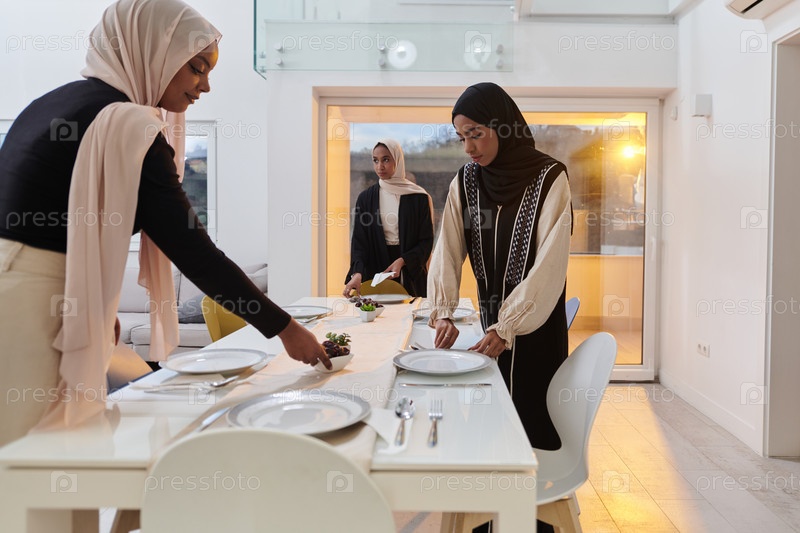 Группа молодых арабских женщин собирается вместе, чтобы с любовью подготовить стол ифтар во время священного мусульманского месяца Рамадан, воплощая в своих кулинарных приготовлениях суть общинного единства, культурных традиций и радостного ожидания