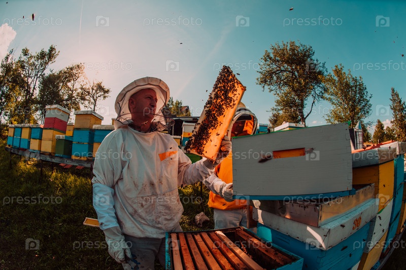 Пчеловоды проверяют мед на рамке улья в поле. Владельцы малого бизнеса на пасеке. Производитель натуральных здоровых продуктов питания работает с пчелами и ульями на пасеке