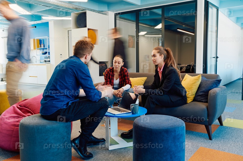 Многонациональная стартап-бизнес-команда встречается в современном ярком коворкинг-офисе под открытым небом. Мозговой штурм, работа на ноутбуке. Группа коллег ходит в размытом состоянии