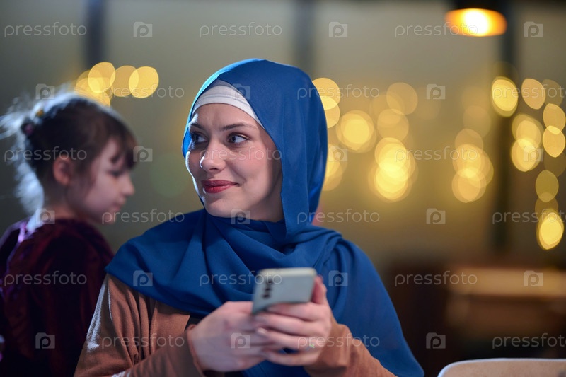 Красивая европейская мусульманка в хиджабе использует свой смартфон, чтобы быстро подготовиться к ифтару во время священного месяца Рамадан, воплощая в своем соблюдении сочетание традиций и современности