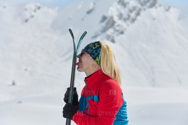 Профессиональная лыжница празднует успех, символически облизывая свои лыжи на вершине заснеженных Альп