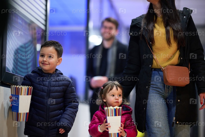 Молодая пара с детьми стоит возле кинотеатра, покупая свежеприготовленный попкорн перед началом фильма и входом в кинотеатр