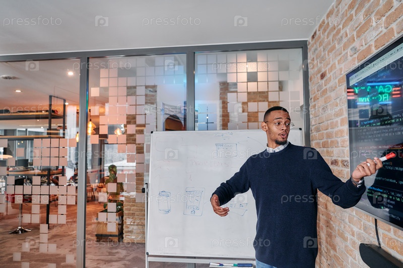 Афроамериканский бизнесмен убедительно презентует свою бизнес-стратегию своим коллегам, способствуя сотрудничеству и дальновидному мышлению
