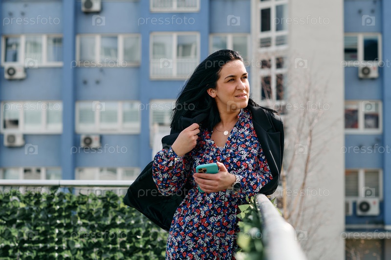 Деловая женщина в черном костюме пользуется смартфоном во время перерыва в современной городской среде