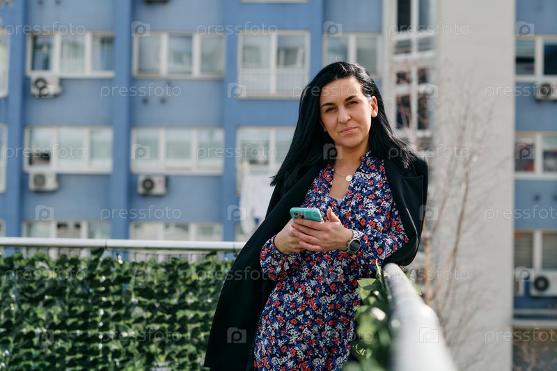 Деловая женщина в черном костюме пользуется смартфоном во время перерыва в современной городской среде