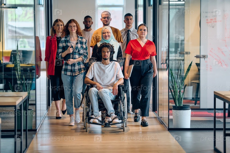 Разнообразная группа молодых бизнесменов собирается в застекленном офисе современного стартапа, в котором участвуют человек в инвалидной коляске, молодой афроамериканец и мусульманка в хиджабе