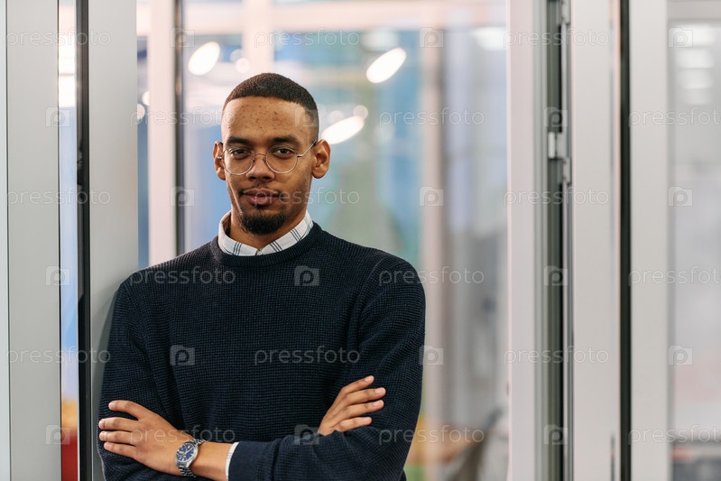 Афро-американский бизнесмен позирует со скрещенными руками в современном офисе