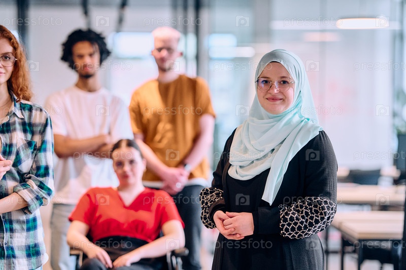 Разнообразная группа молодых бизнесменов, идущих по коридору в застекленном офисе современного стартапа, включая человека в инвалидной коляске и женщину в хиджабе