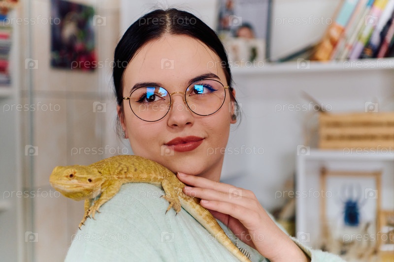 Красивая женщина позирует со своими очаровательными бородатыми драконами
