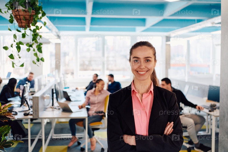 Портрет молодой улыбающейся деловой женщины в творческом коворкинг-стартапе на открытом пространстве. Успешная деловая женщина, стоящая в офисе с копировальным пространством. Коллеги работают в фоновом режиме