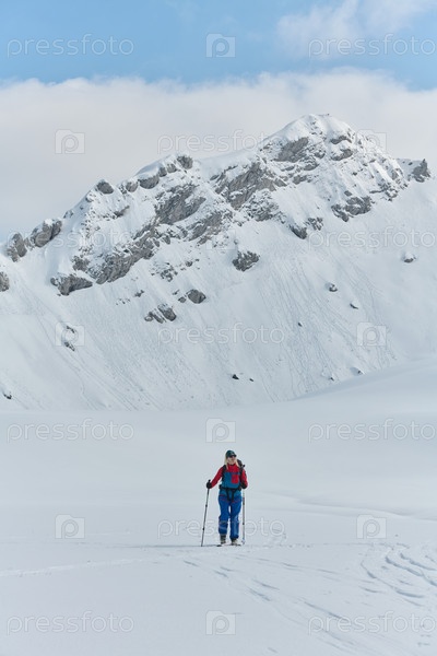 Женщина-альпинистка поднимается в Альпы со снаряжением для бэккантри
