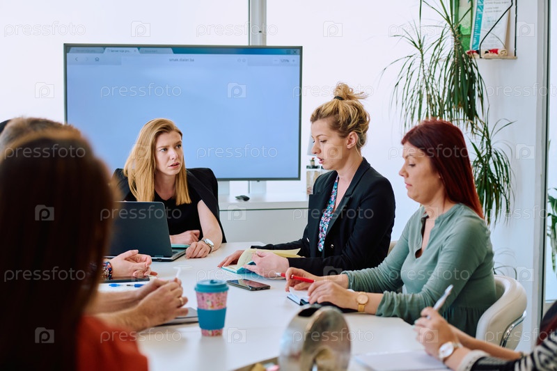 Разнообразная бизнес-команда обсуждает проекты в современном стеклянном офисе