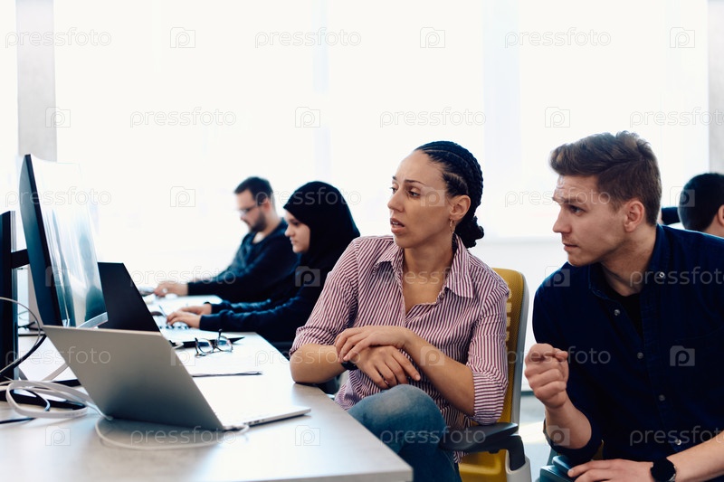 Совместный процесс мультикультурной квалифицированной молодой бизнес-команды во время мозгового штурма в офисе. Разнообразная группа молодых людей, одетых в формальную одежду, сотрудничает в разработке дизайн-проекта