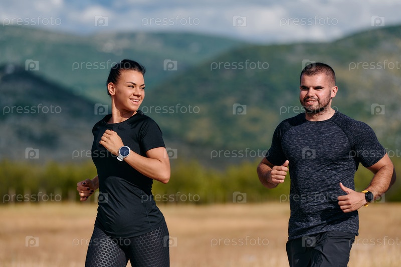 Пара, поддерживающая здоровый образ жизни, бегая в солнечный день