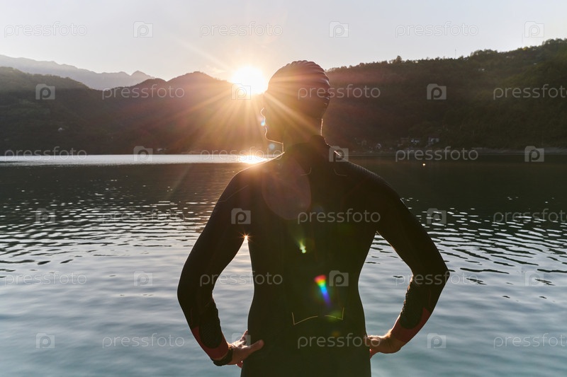 Настоящий спортсмен по триатлону готовится к тренировке по плаванию на озере