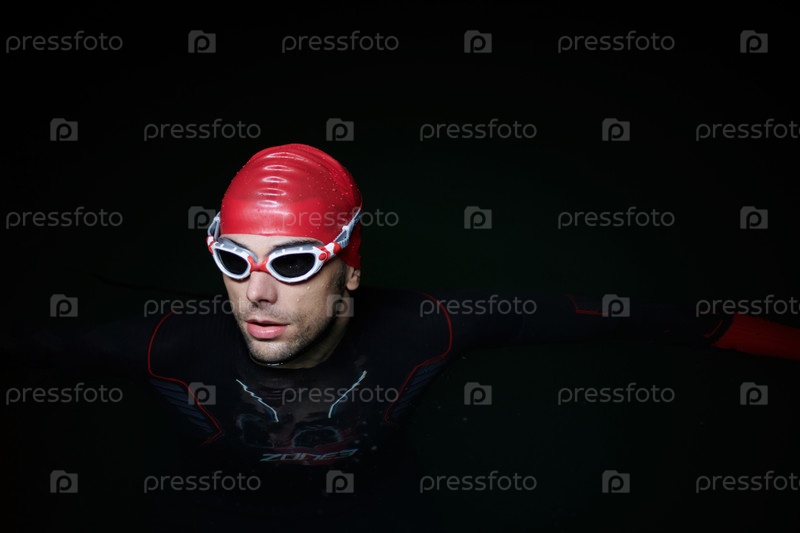 Решительный профессиональный триатлонист проходит тщательную ночную тренировку в холодной воде, демонстрируя преданность делу и стойкость в подготовке к предстоящим соревнованиям по триатлону по плаванию