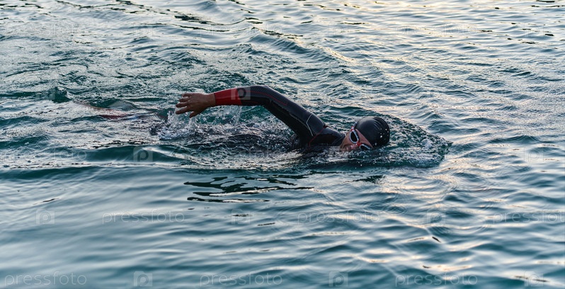 Профессиональный триатлонист с непоколебимой преданностью тренируется перед предстоящими соревнованиями на озере, излучая чувство атлетизма и глубокое стремление к совершенству
