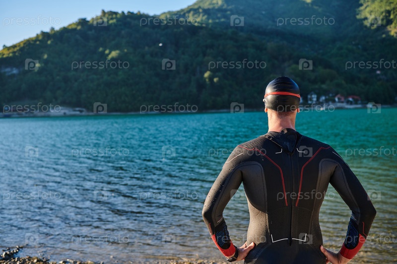 Настоящий спортсмен по триатлону готовится к тренировке по плаванию на озере