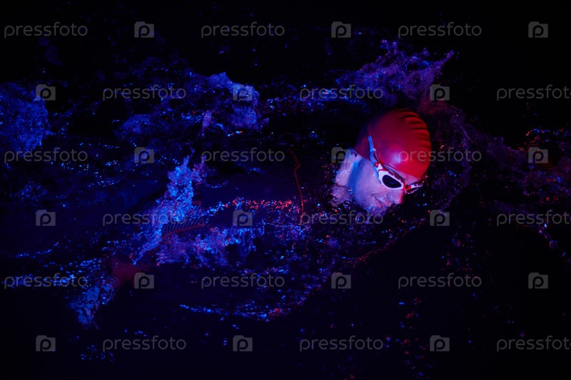 Настоящий пловец-триатлет, отдыхающий во время тяжелых тренировок при ночном неоновом гелевом свете