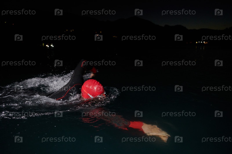 Решительный профессиональный триатлонист проходит тщательную ночную тренировку в холодной воде, демонстрируя преданность делу и стойкость в подготовке к предстоящим соревнованиям по триатлону по плаванию