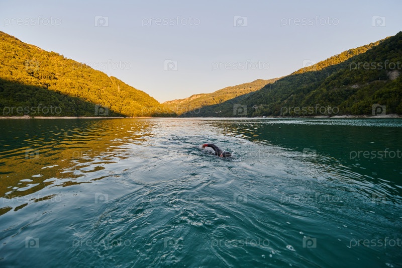 Спортсмен по триатлону плавает на озере на рассвете в гидрокостюме