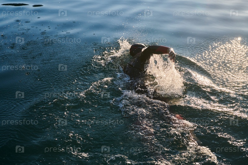 Спортсмен по триатлону плавает на озере на рассвете в гидрокостюме
