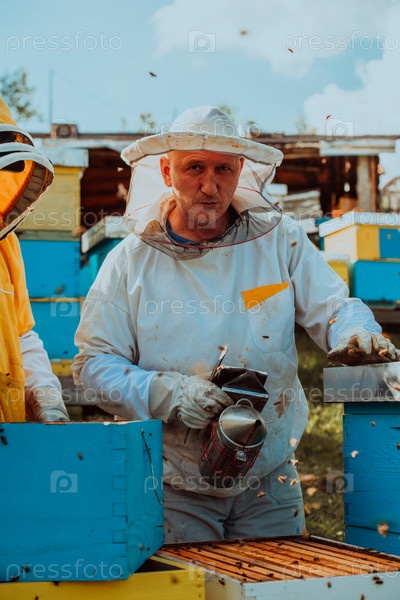 Пчеловоды проверяют мед на рамке улья в поле. Владельцы малого бизнеса на пасеке. Производитель натуральных здоровых продуктов питания работает с пчелами и ульями на пасеке