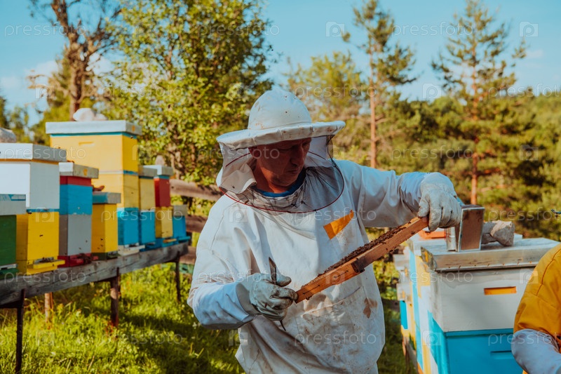 Пчеловоды проверяют мед на рамке улья в поле. Владельцы малого бизнеса на пасеке. Производитель натуральных здоровых продуктов питания работает с пчелами и ульями на пасеке