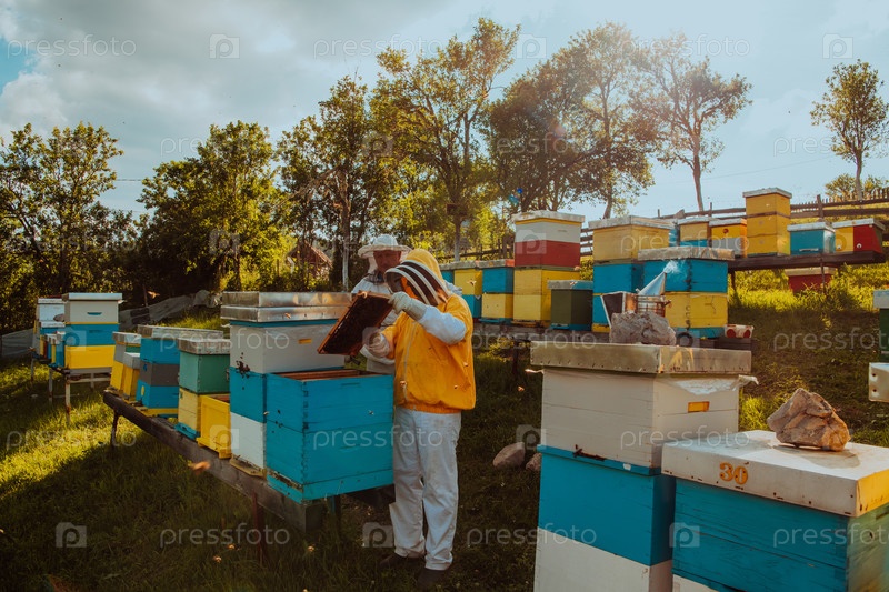 Пчеловоды проверяют мед на рамке улья в поле. Владельцы малого бизнеса на пасеке. Производитель натуральных здоровых продуктов питания работает с пчелами и ульями на пасеке
