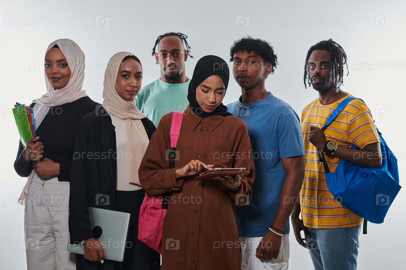 Группа разнообразных студентов занимается современными образовательными практиками, используя различные технологические инструменты, такие как ноутбуки, планшеты и смартфоны, на чистом белом фоне, иллюстрируя современный подход к совместному обучению и до